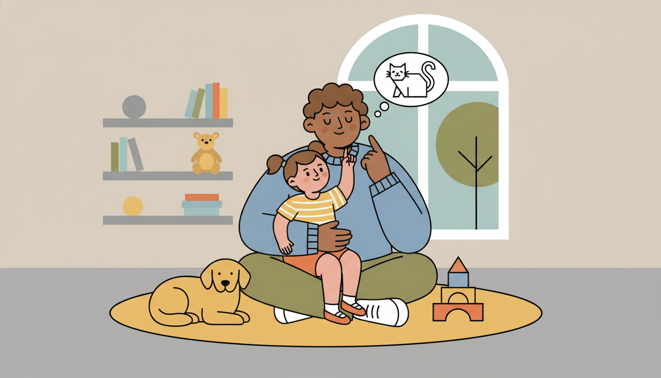 Play a simple guessing game that invites your child into your thoughts. Think of a familiar object or animal and give them easy clues. Say "I'm thinking of something soft and furry that says meow." Respond warmly to their guesses, whether right or wrong. If they guess dog instead of cat, say "Good thinking. Dogs are furry too. This one says meow though." When they guess correctly, show genuine delight through smiles, gentle applause, or a warm hug. Let them give you clues too, even if they're hard to follow. Respond with warmth and interest to their attempts.