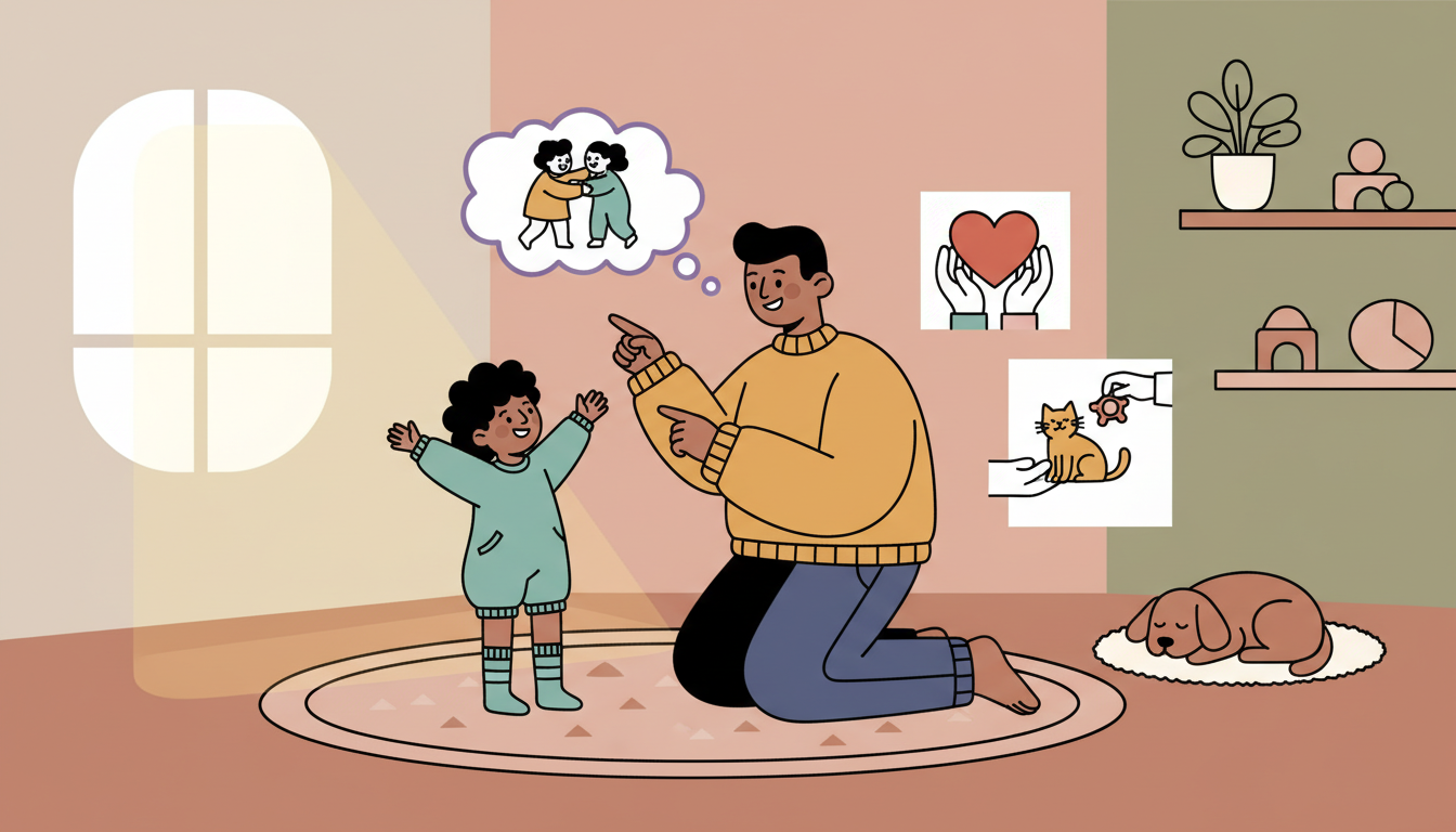 Take turns acting out kind actions while the other person guesses. Show hugging, sharing, helping, or comforting someone sad. Talk about how these actions make people feel. Celebrate when your child guesses correctly or comes up with creative kind actions. This builds empathy and social emotional skills through active play.