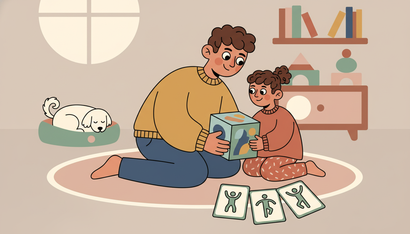 Create a simple dice game where each number represents a different physical movement. Roll a dice and do that many of the assigned movement. For example, one equals jumping jacks, two equals hops, three equals arm circles. Your child can help choose which movements match each number. This turns physical activity into a fun game you can play together for a few minutes each day.