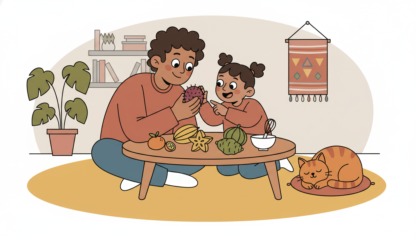 Each week, let your child choose one new food to try at the grocery store or market. It might be an unfamiliar fruit, vegetable, or grain. Before eating it, examine it together. Talk about color, smell, texture, and where it might come from. Let your child help prepare it if possible. Then taste it together and discuss what you notice about the flavor and texture.
