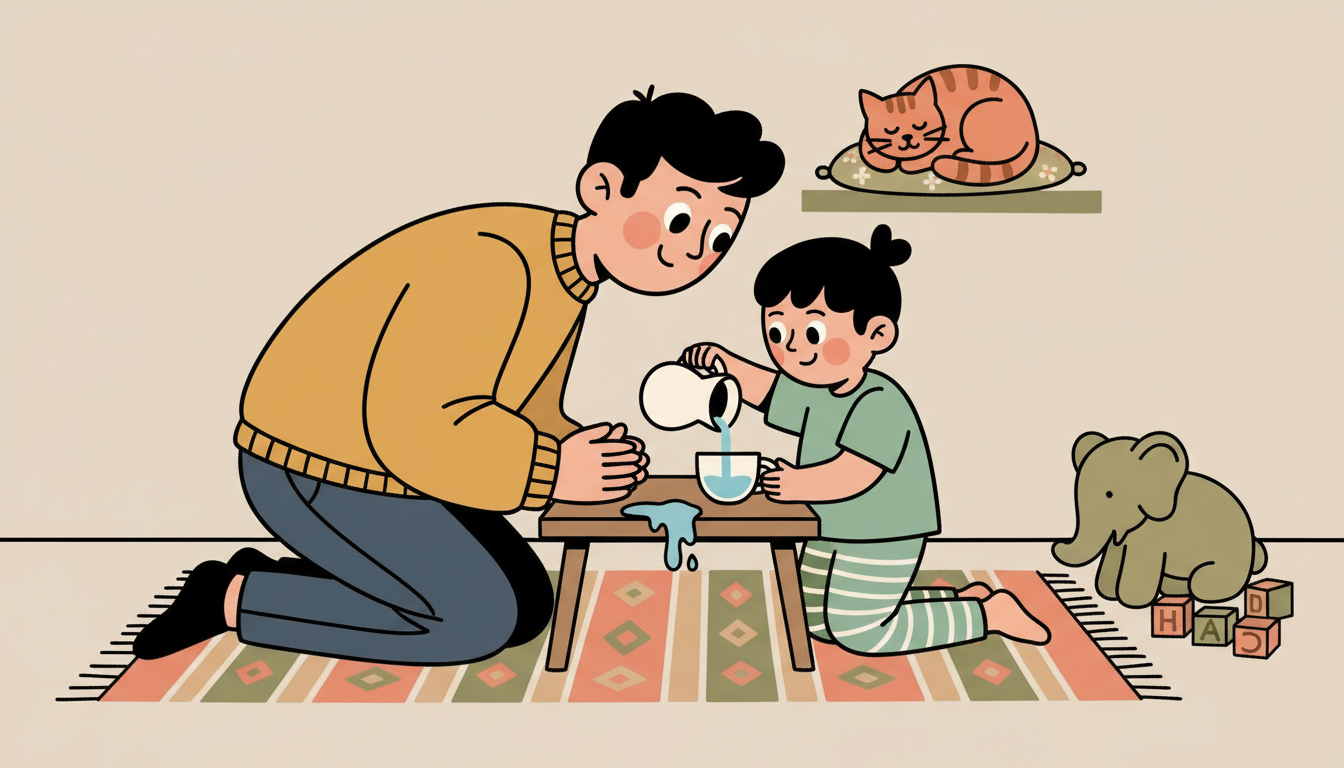 Focus on their growing capability rather than perfection. Say things like, you are learning to pour carefully, instead of pointing out spills. Skills develop through practice, and your confidence in them builds their confidence in themselves.