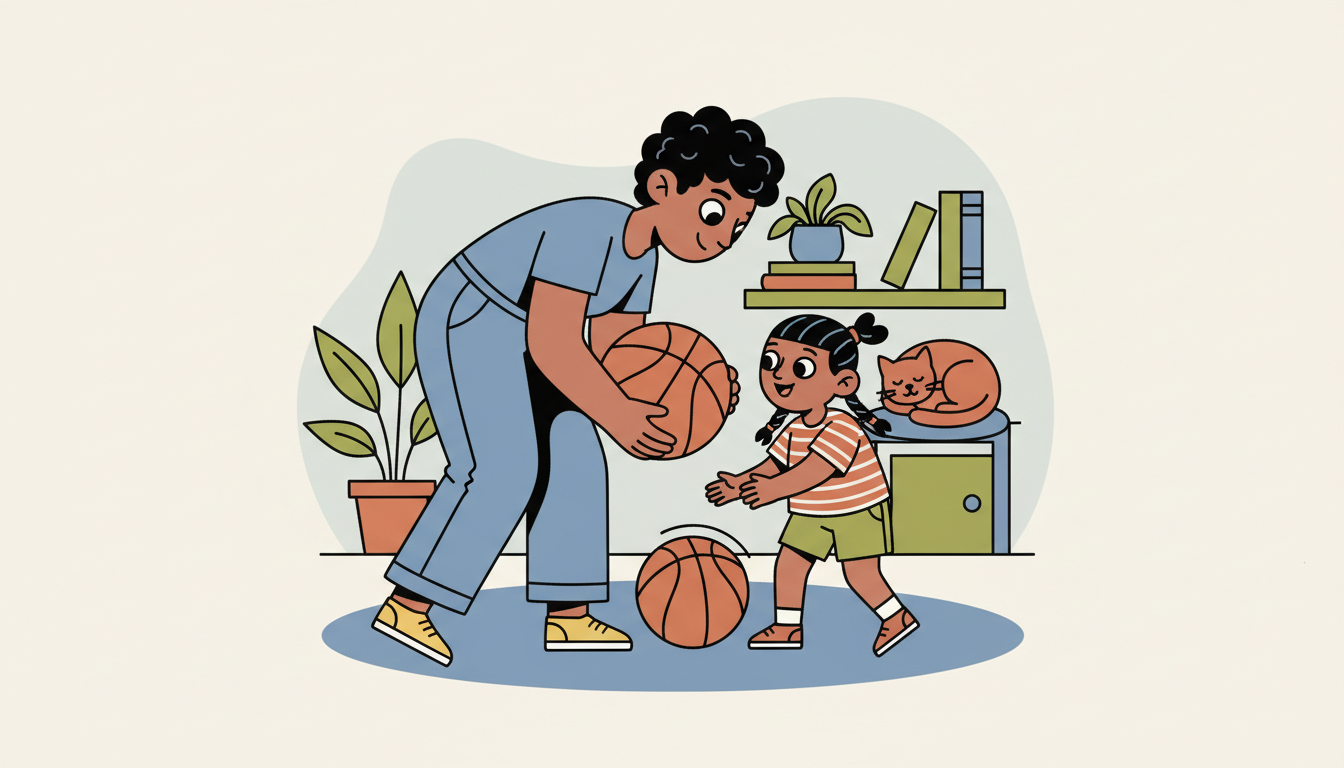 Choose a simple sports skill to practice together, like kicking a ball back and forth, throwing and catching, or bouncing a ball. Practice for a few minutes regularly and notice improvements together. Take turns showing each other new tricks or ways to play. Keep it playful rather than competitive.