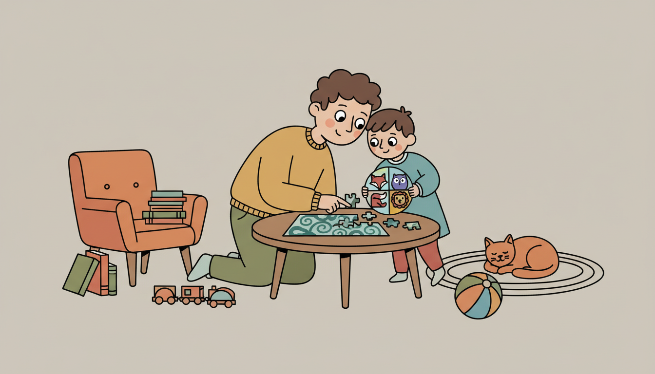 Start with a puzzle your child can already complete. Once finished, introduce a slightly harder puzzle with more pieces or smaller parts. The goal is not to finish the harder puzzle today, but to try it and notice what makes it challenging. Put it away and return to it tomorrow. Over several days, watch as pieces that seemed confusing become familiar. Talk about how their brain is learning the new puzzle, even when they are not working on it.