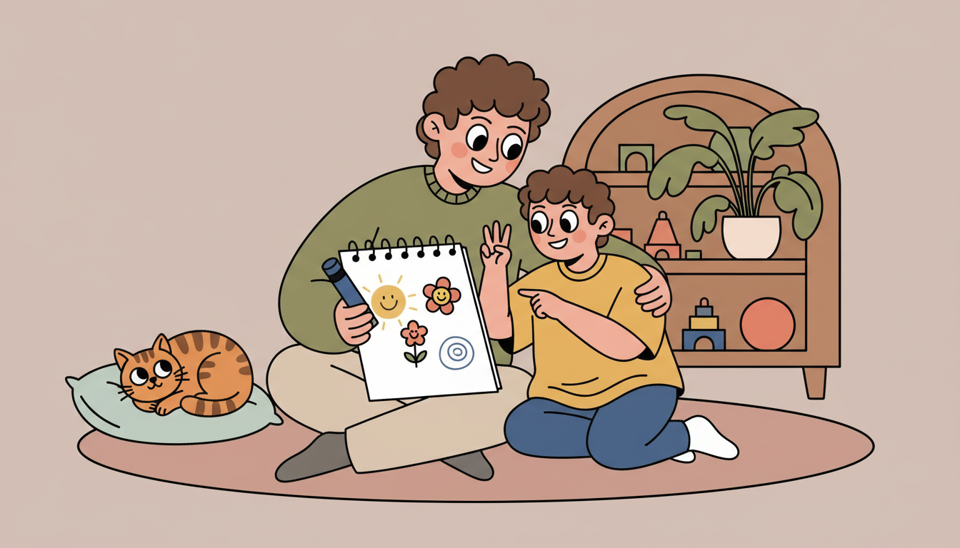 At the end of your day together, sit down with your child and ask them to share three good things that happened. These can be big or small. Write them down or draw simple pictures together. This helps your child notice and remember positive moments. You can take turns sharing your own three good things too. Keep it relaxed and conversational.