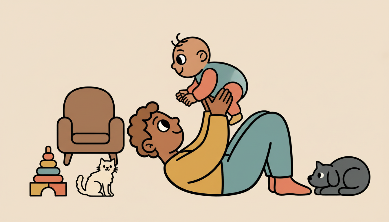 Lie on your back with knees bent and feet flat on the floor. Place your child on your shins, facing you, and hold them securely under their arms. Gently lift your legs to raise them into the air, keeping them secure and at a comfortable height. Make eye contact and talk or sing to them. This builds their core strength while creating joyful connection.