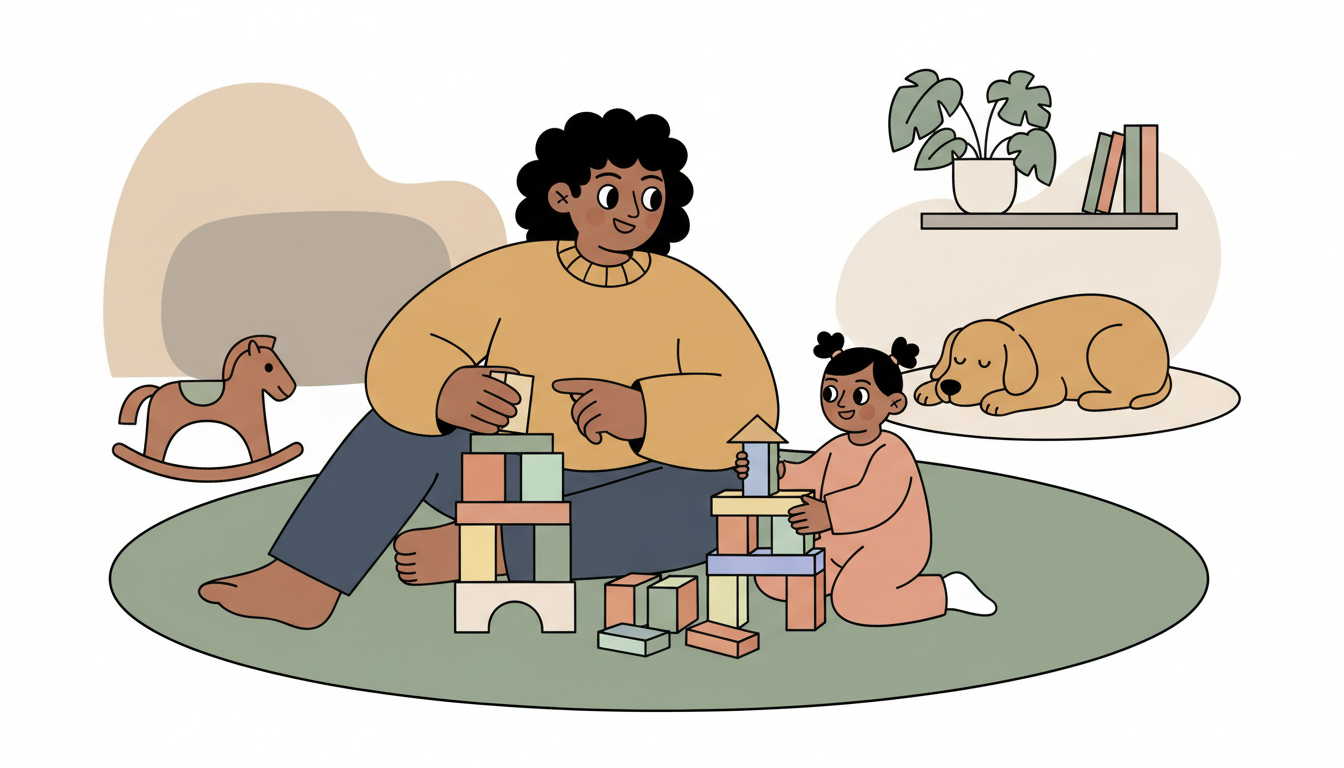 Sit next to your child with blocks and build your own towers at the same time. This parallel play lets them explore independently while staying connected to you. Occasionally trade blocks or comment on what each of you is building. This helps them get comfortable with nearby play partners.