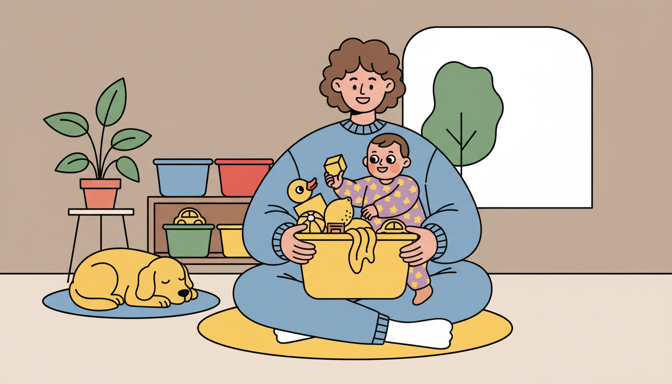 Fill a container with objects of the same color from around your house. Use safe items like toys, fabric scraps, or clean kitchen items. Let your child explore the collection, handling each piece. You can make different color bins over time. They'll begin noticing similarities while satisfying their drive to touch and examine everything. Name the color as they play.