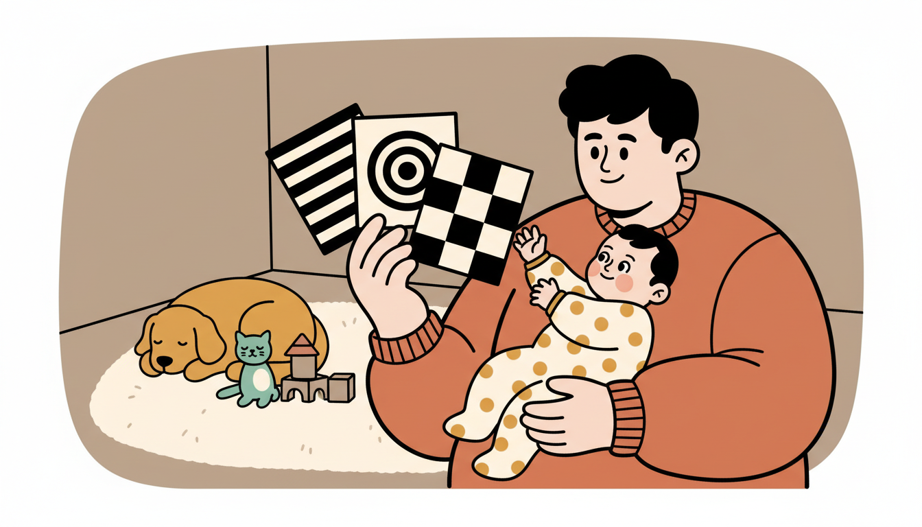 Show your child simple high-contrast images or patterns, like black and white stripes, dots, or simple shapes. Hold each card about eight to 12 inches from their face for a few moments, then slowly move it side to side. Young infants are drawn to bold contrasts and will track the movement with their eyes, exercising their visual attention.