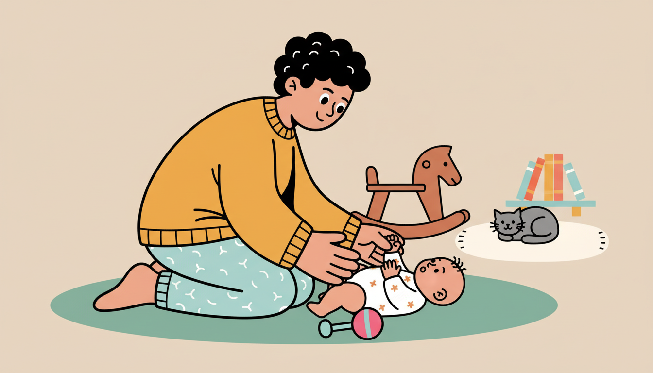 During diaper changes, describe what you're doing in a calm voice. When your child makes sounds, pause and respond as if having a conversation. Wait for their coos or gurgles, then reply with words or gentle sounds. This back-and-forth exchange happens naturally during routine care.
