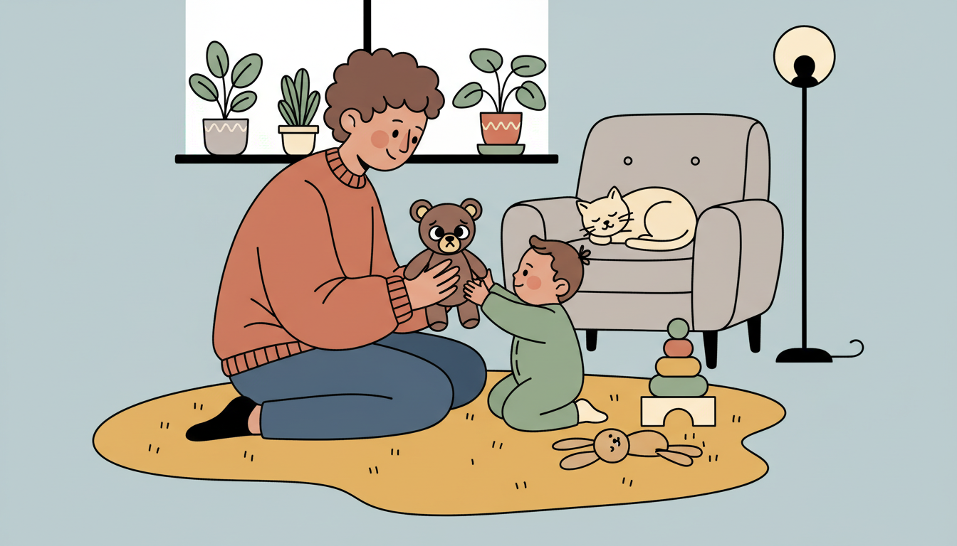 During play time, use your child's toys to act out simple emotional scenarios. Make a stuffed bear sad because it lost its toy, then help it feel better. Use simple language like 'Bear is sad. Bear needs a hug.' Invite your child to help comfort the toy. This uses symbolic play to explore feelings safely.