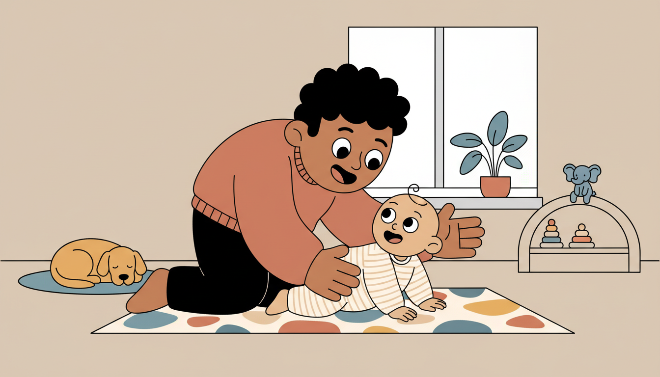Place your child on their tummy for brief periods while you stay at eye level with warm, encouraging expressions. Talk in a positive, upbeat tone and celebrate their efforts to lift their head or push up. Your encouraging presence during this challenge helps them experience difficulty with positive support.