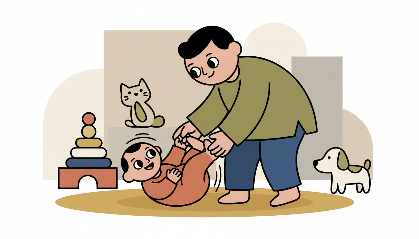 Lay your child on their back and gently move their legs in a cycling motion, as if they are pedaling a bicycle. Move slowly and rhythmically, singing or talking as you go. This activity promotes hip flexibility and leg strength while creating joyful movement patterns. You can do this during diaper changes or playtime.