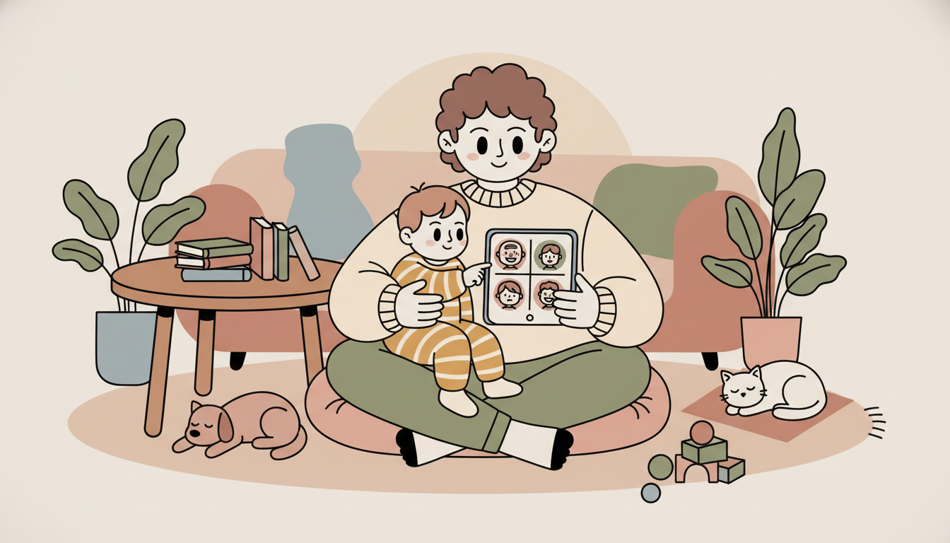 Look at family photos together and talk about how people feel in each picture. Point to smiling faces and say 'Grandma is happy.' Point to someone crying and say 'You were sad.' Keep it simple and clear. Let your child point at faces too. This activity helps your child learn that everyone has feelings and those feelings show on their faces.