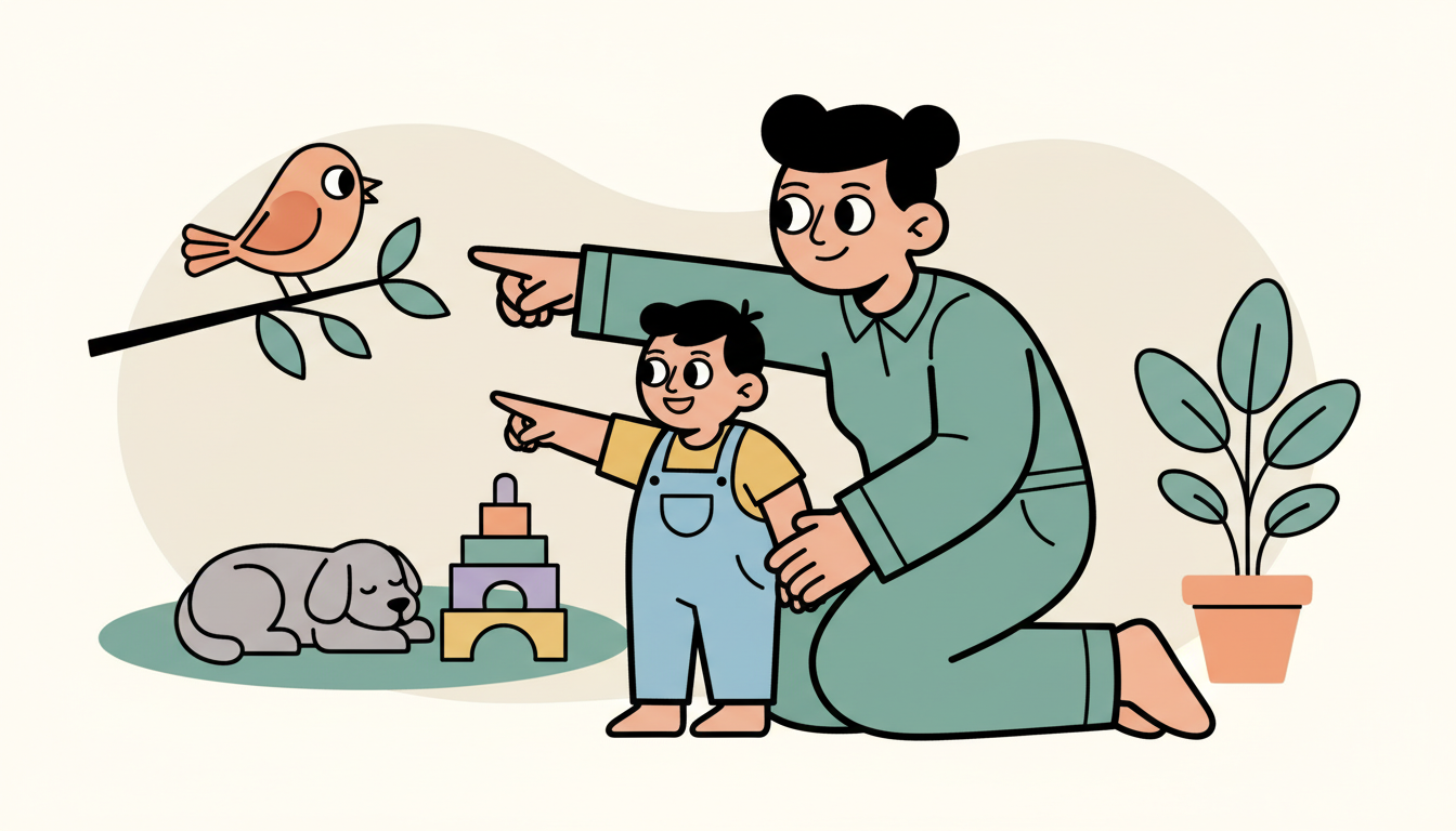 When you're playing together or out for a walk, point out interesting things and encourage your child to point too. Say 'look, a bird' or 'I see a truck.' Respond with interest when they point to share something with you. This back-and-forth builds early conversation skills and social connection.