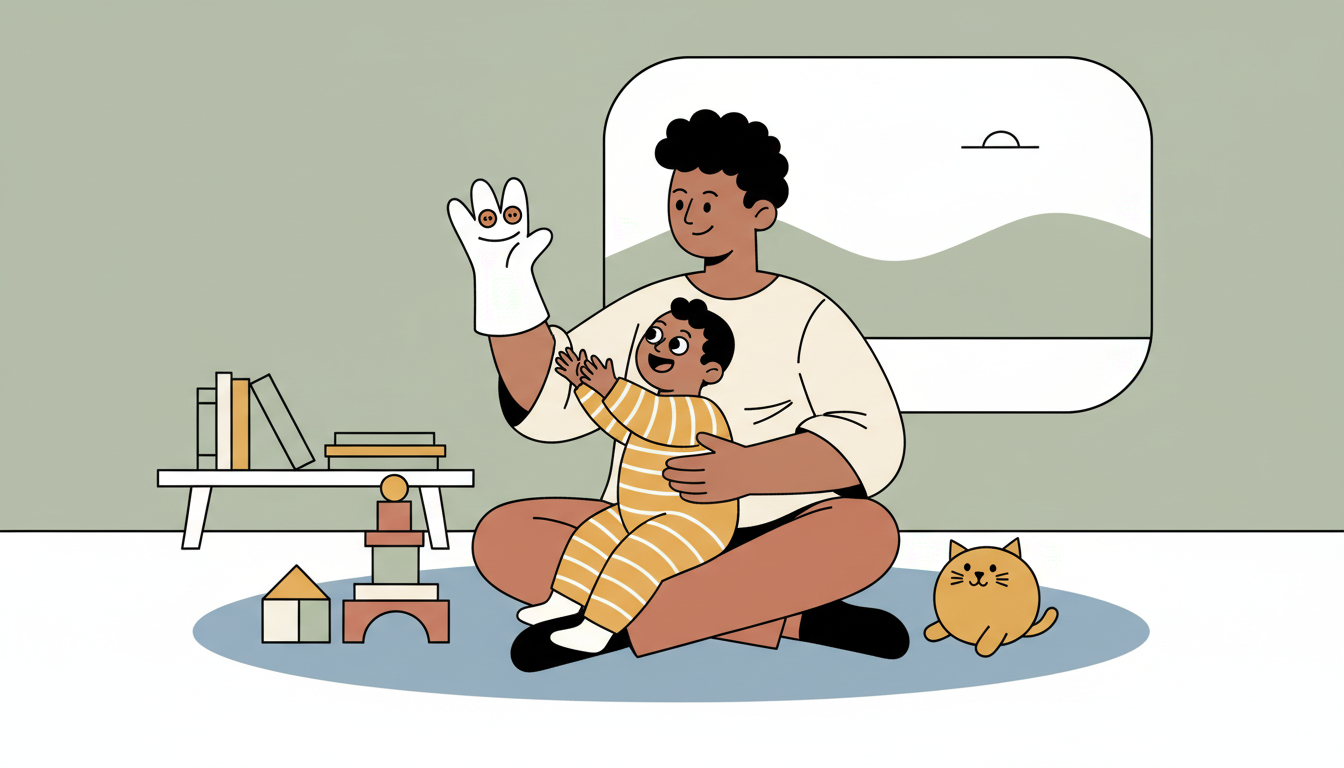 Use a simple puppet, stuffed animal, or even a sock on your hand as a pretend friend. Have the puppet say hello to your child, wave, and ask simple questions like "can I see your toy?" Speak in a slightly different voice for the puppet to make it clear this is a different character. Encourage your child to respond by waving, offering a toy, or just watching. The puppet can give gentle hugs, share toys, or play peek-a-boo. This pretend social interaction is a safe way for your child to practice social skills without the unpredictability of peer interaction.