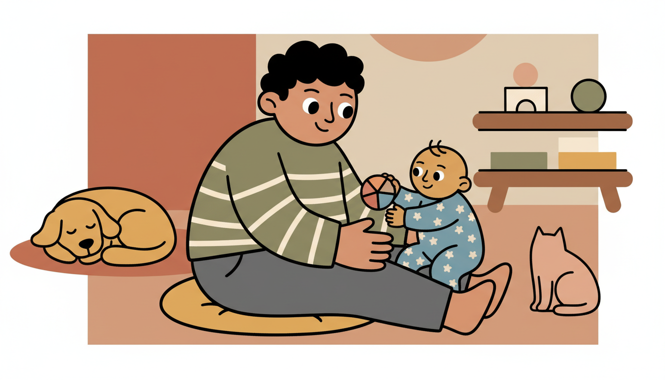 Give your child a small toy to hold in one hand. Place your hand near their other hand and see if they'll transfer the toy across. Narrate what you observe: 'You're figuring out how to move it' or 'Your hands are working together.' Don't rush to help. Let them explore the problem at their own pace.